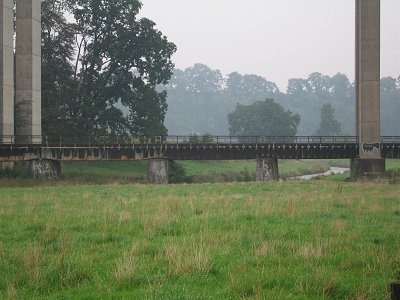 ![]() Almebrücke hinter Ahden, 27.08.06 Diese Brücke ist besonders: sie läuft zwischen den Pfeilern der Autobahnbrücke hindurch. Hier kreuzen sich vier Verkehrsebenen: Wasser, Land, Bahn, Autobahn. |
