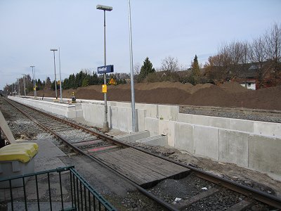 ![]() 28.03.: Der Übergang und die Rampe brauchen noch ein Geländer. Das Stationsschild ist übrigens zur Zeit das einzige im Bahnhof. Am Bahnsteig ist kein Schild abgebracht. |