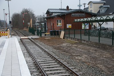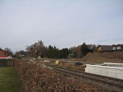 ![]() 16.03.: Der neue Bahnsteig am Empfangsgebäude. Die Erdhügel sind der Dreck, den der Bauzug hier abgelagert hat. |