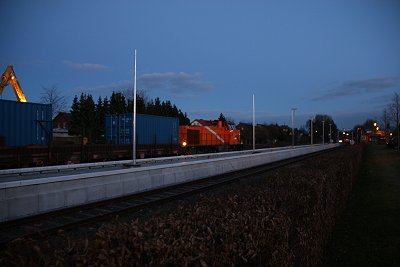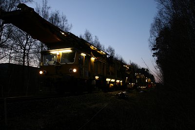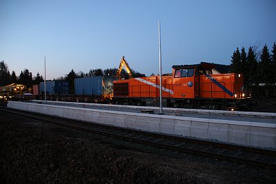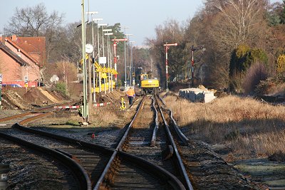 ![]() 16.03.: Nein, es wird nicht auf Breitspur umgebaut. Der BÜ an der B68 wird erneuert, hier arbeiten gerade die Arbeiter der Firma Falkenhahn an dem Anschluß von altem und neuem Gleis. |