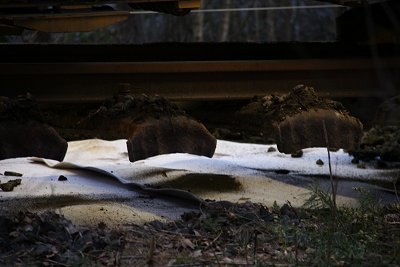 ![]() 14.03.: Fließbänder zwischen den Wagen für den Dreck: Der Zug säubert den Schotter und lagert den Abfall in diesen Wagen. |