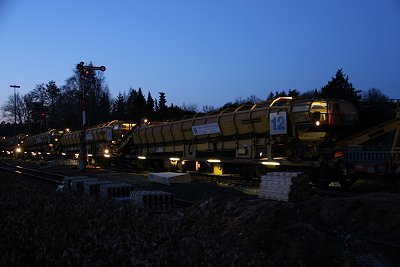 ![]() 16.03.: Nun werden die seit 1 Jahr bereit liegenden Betonschwellen eingebaut. |