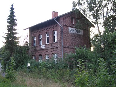 ![]() Bahnhof Ahden Leicht versteckt steht das Gebäude, das als Wohnhaus genutzt wird. Davor befindet sich ein aufgeschütteter, nie benutzer Bahnsteig. |
