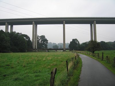 ![]() Almebrücke hinter Ahden, 27.08.06 Diese Brücke ist besonders: sie läuft zwischen den Pfeilern der Autobahnbrücke hindurch. Hier kreuzen sich vier Verkehrsebenen: Wasser, Land, Bahn, Autobahn. |