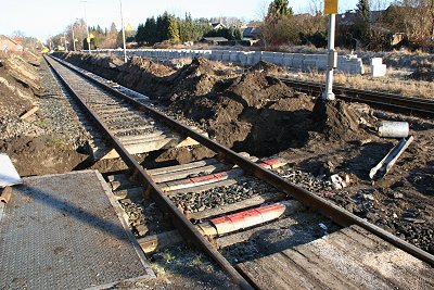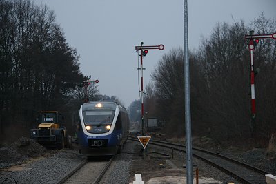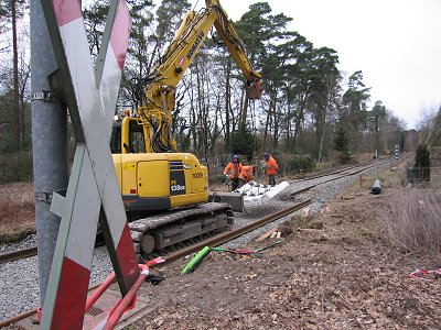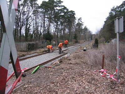 ![]() 16.03.: Nein, es wird nicht auf Breitspur umgebaut. Der BÜ an der B68 wird erneuert, hier arbeiten gerade die Arbeiter der Firma Falkenhahn an dem Anschluß von altem und neuem Gleis. |