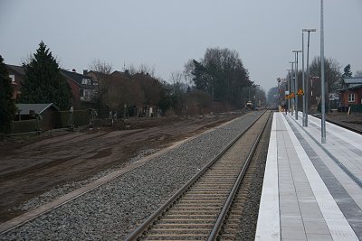 ![]() 16.03.: Der neue Bahnsteig am Empfangsgebäude. Die Erdhügel sind der Dreck, den der Bauzug hier abgelagert hat. |