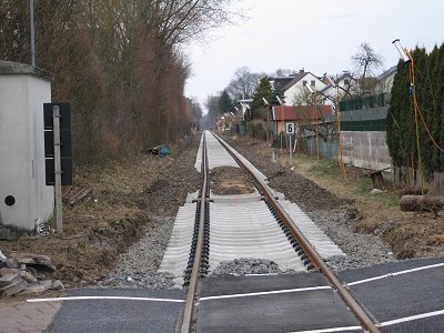 16.03.: Der Oberbau wird auf der gesamten Strecke erneuert. Das neue Gleis mit den Betonschwellen liegt und wartet auf das Einschottern. Der BÜ Dümmerweg ist noch vorhanden, aber gesperrt. 27.03.: Der Oberbau ist erneuert, die Bahnübergänge sind fertig. Allerdings ist der neu BÜ Hatzfelder Straße nun nicht mehr eben, sondern ein Hügel. Der BÜ Dümmerweg ist bahntechnisch nun nicht mehr existent, allerdings immer noch passierbar. |