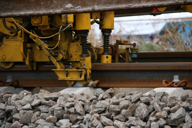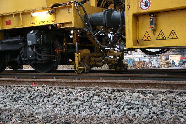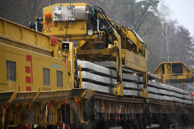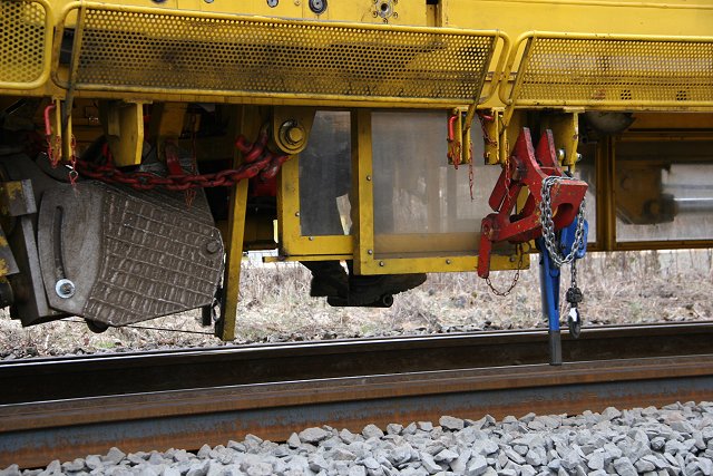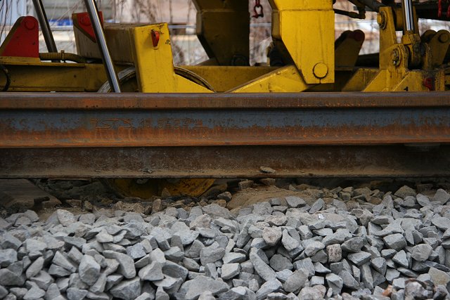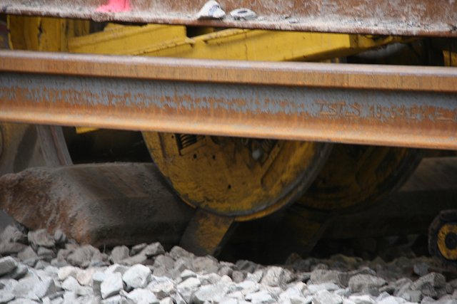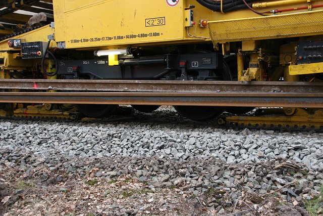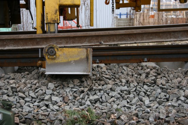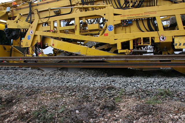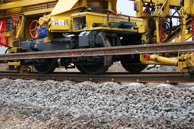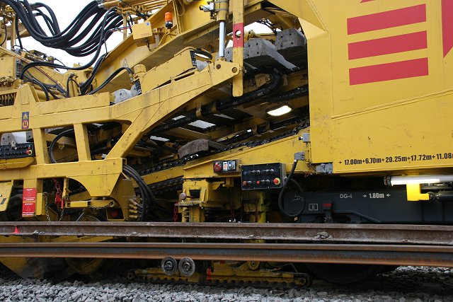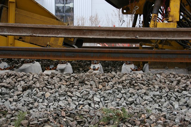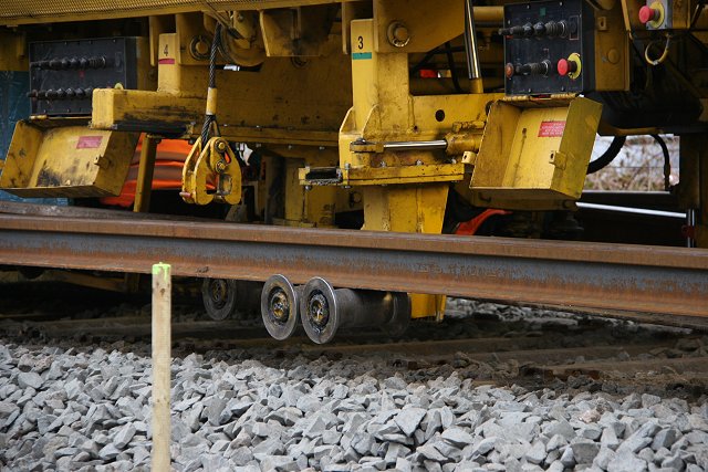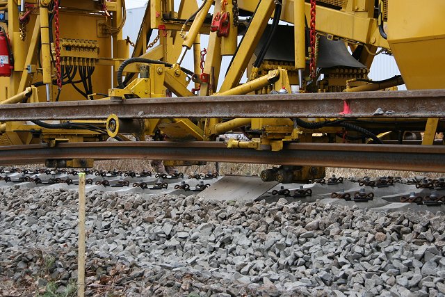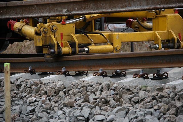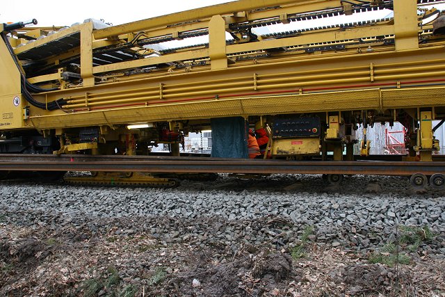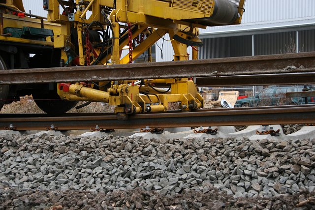 Schwellenwechsler: die neuen Schienen werden in die Schwellen gedrückt