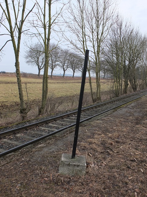 Die B�sche am Bahnsteig sind zur�ckgeschnitten. Eine einsame Stange wacht �ber den HP.