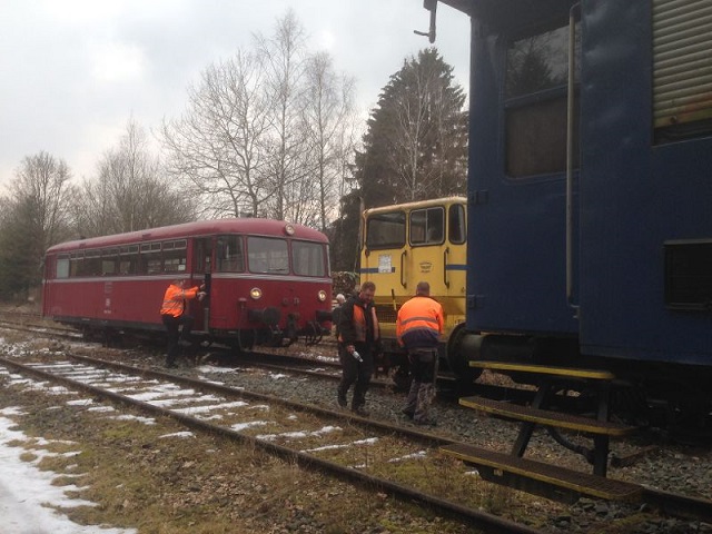 die Vorbereitungen zum Ankuppeln der Waldbahnfahrzeuge laufen