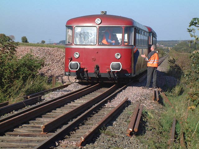 Am Samstag, 22.09. sollte die jährliche Herbstsause der Waldbahn nach Willingen stattfinden, eine Tagestour mit typischen Nebenbahnfahrzeugen aus dem Jahr 1960 und reichlich Spaß im Sauerland. Doch die Fahrt gestaltete sich anders als geplant. Um 9:15 Uhr startete der mit 90 Fahrgästen voll besetzte historische Zug der Baureihe 798 in Ringelstein zu seinem Tagesausflug nach Willingen. Doch nach 1 Stunde geschah, womit niemand rechnete: der Zug entgleiste kurz vor Brilon bei Kilometer 48,23. In der dort befindlichen Baustelle hatte die Gleisbaufirma Schienen am Streckengleis gelagert. Daß diese Schienen zu hoch gelagert waren, war für den Triebfahrzeugführer nicht zu erkennen und so setzten beide Triebwagen mit den Achslagern auf diesen Schienen auf und wurden regelrecht aus dem Gleis gehebelt. Der erste Triebwagen fuhr komplett in den Schotter, der zweite Triebwagen hing noch mit einem Rad im Gleis. Verletzt wurde bei dem Unglück niemand. Die Fahrgäste verhielten sich die ganze Zeit über ruhig und konnten nach gut einer Stunde mit Bahnbussen ihren Ausflug fortsetzen. Mit professioneller Unterstützung durch DBNetz wurde noch am Nachmittag die Bergung der Fahrzeuge durchgeführt, die mit der Abstellung der Fahrzeuge in Ringelstein um 22:30 Uhr endete. Wie hoch die Schäden an den Fahrzeugen sind, muß nun durch einen Gutachter festgestellt werden. |