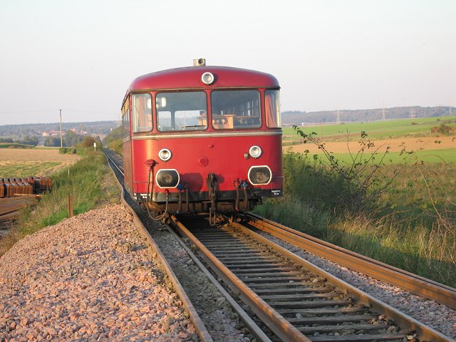 ![]() 20 Uhr, der hintere Radsatz ist fast wieder im Gleis. Der Vordere muß noch bis 21 Uhr warten, dann ist auch er wieder aufgegleist. Mit Vmax 5 km/h fuhren beide VT dann mit eigener Kraft zurück nach Ringelstein. |